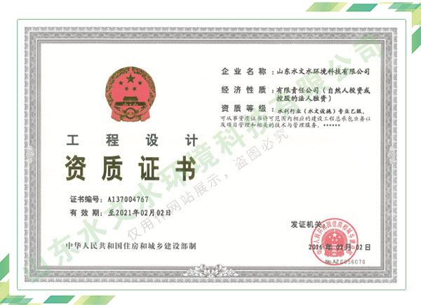 公司擁有水利工程設(shè)計(jì)、水土保持、水文水資源調(diào)查評(píng)價(jià)、水資源論證、建設(shè)項(xiàng)目環(huán)境影響評(píng)價(jià)、市政公用工程施工總承包、水利水電工程施工總承包、電子與智能化工程專(zhuān)業(yè)承包等資質(zhì),2017年通過(guò)質(zhì)量管理體系、環(huán)境管理體系、職業(yè)健康安全管理體系認(rèn)證;2020年被評(píng)為國(guó)家級(jí)高新技術(shù)企業(yè),同年被中國(guó)水利企業(yè)協(xié)會(huì)推薦為第一批“合同節(jié)水服務(wù)企業(yè)”;2021年被山東省、濟(jì)南市評(píng)為 “專(zhuān)精特新”中小企業(yè)。業(yè)務(wù)范圍涉及水利工程設(shè)計(jì);節(jié)水設(shè)計(jì)、改造、水平衡測(cè)試;山洪災(zāi)害調(diào)查;城市水資源調(diào)查評(píng)價(jià);建設(shè)項(xiàng)目水土保持方案編制、監(jiān)測(cè)、驗(yàn)收、水土保持規(guī)劃;水安全保障規(guī)劃、建設(shè)項(xiàng)目水資源論證、規(guī)劃水資源論證;建設(shè)項(xiàng)目環(huán)境影響評(píng)價(jià);入河排污口論證;防洪影響評(píng)價(jià);市政公用工程施工、水利水電工程施工、電子與智能化工程施工等。